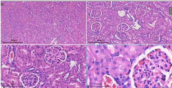 4倍:清晰划分肾皮质、髓质、肾锥体等大结构区域。 -