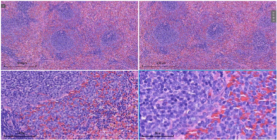 4倍:清晰区分白髓(淋巴组织聚集区)与红髓(血窦为主)区域。 -