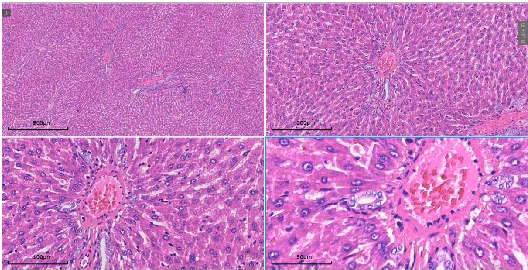 10倍:清晰显示门管区与中央静脉周围的肝血窦网络。 -