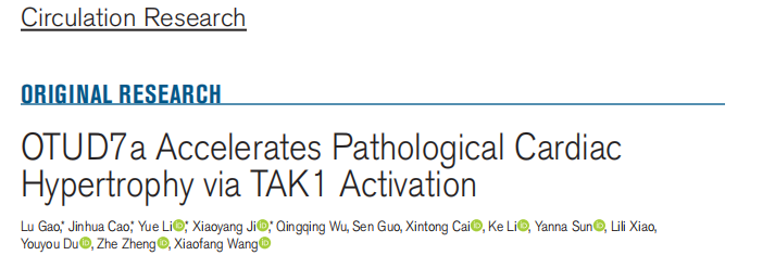 心肌肥厚是导致心力衰竭和心脏性猝死的主要原因之一,OTUD7a是一种去泛素化酶,也是一种潜在的肿瘤抑制因子,此前被证实与神经发育障碍和肿瘤相关,其对心血管疾病尤其是心脏肥大的作用尚未阐明。2025年11月21日,郑州大学第一附属医院王小芳/郑哲团队在Circulation Research (IF 16.2)在线发表文章“OTUD7a Accelerates Pathological Cardiac Hypertrophy via TAK1 Activation”,研究首次证实OTUD7a 是病理性心肌肥厚的新型促进因子,并表明靶向OTUD7a-TAK1轴是治疗心肌肥厚及相关心力衰竭的潜在有效策略。